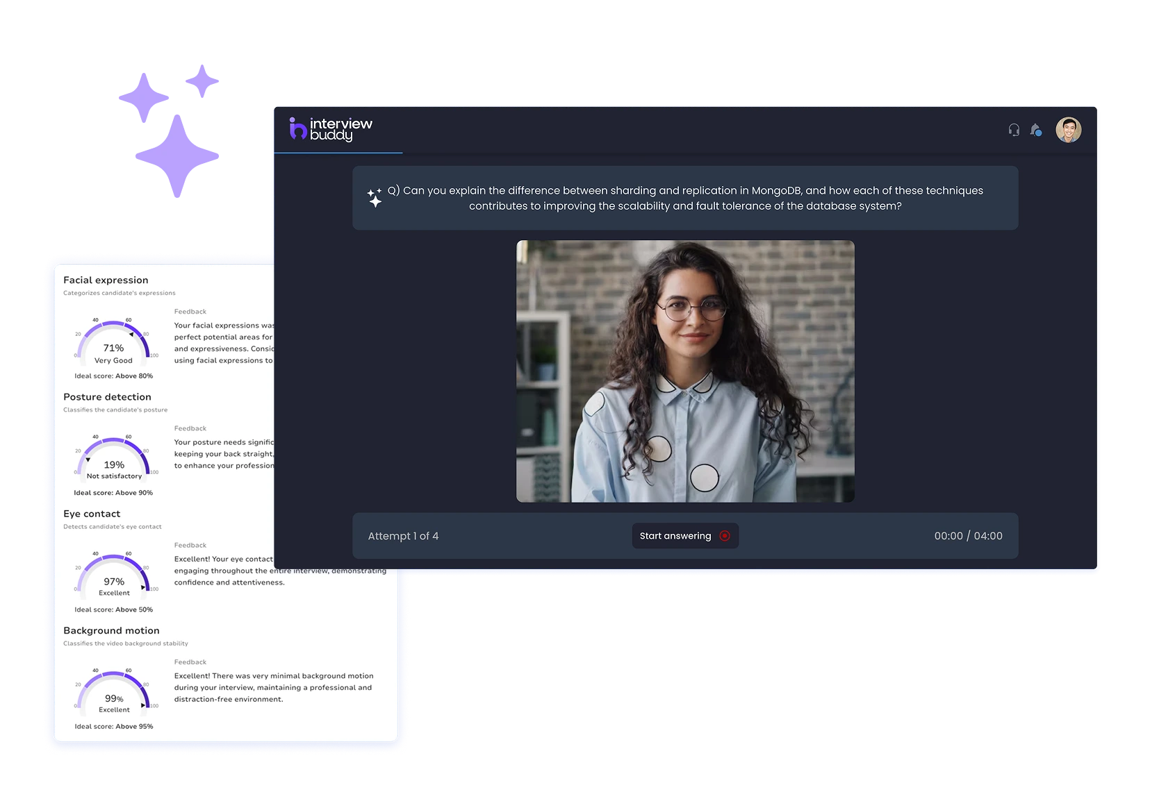 Our AI assesses your answers, confidence, and speaking style and provides instant, structured feedback to help you improve.